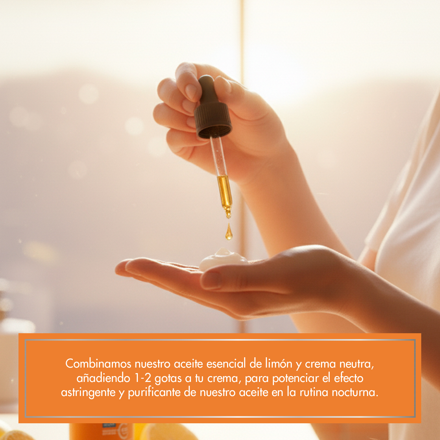Aceite esencial de limón 100% puro. Propiedades antisépticas, astringentes y revitalizantes. Ideal para tratamientos faciales, corporales y aromaterapia profesional.