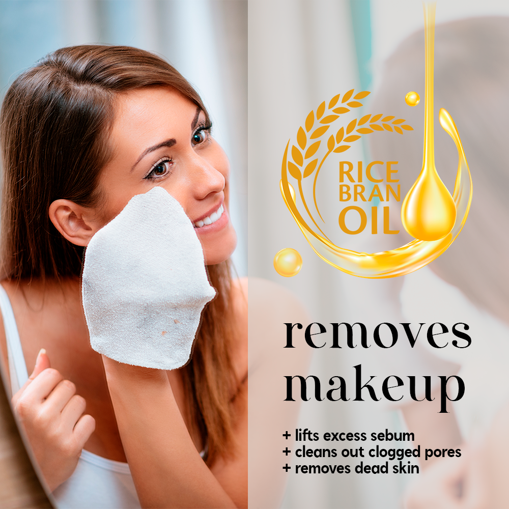 El aceite de arroz se encarga de eliminar el maquillaje preservando un nivel de pH natural en la piel, lo que lo hace idóneo para pieles secas y sensibles.