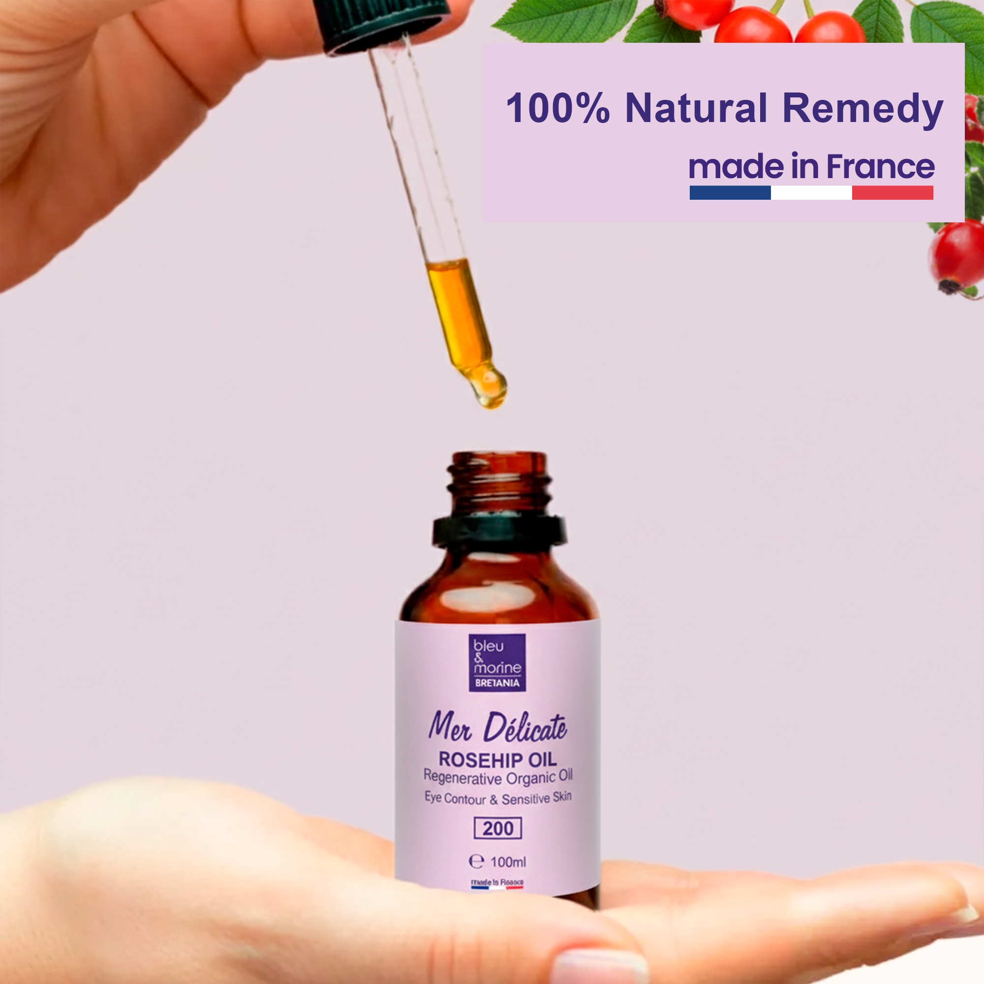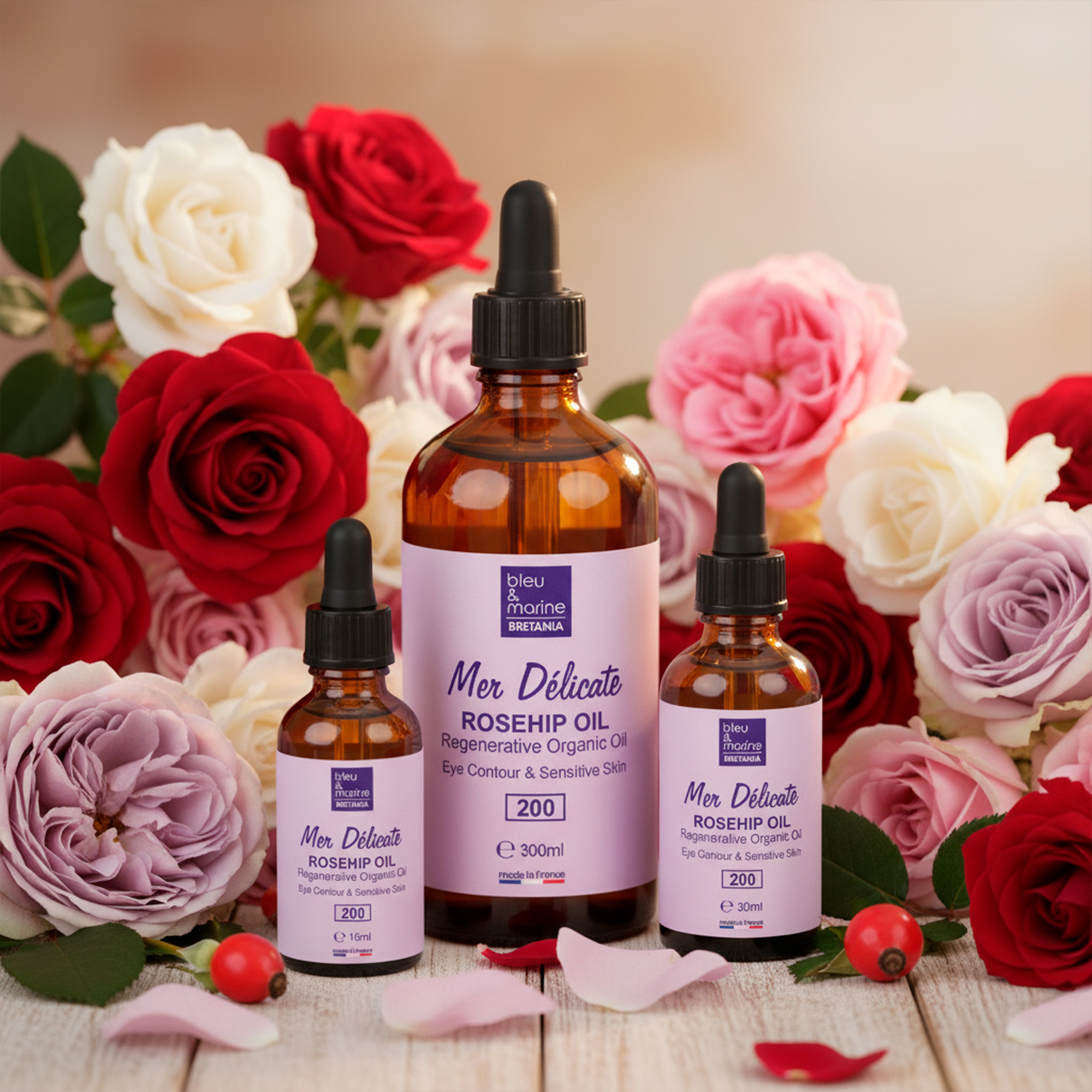El Aceite Orgánico de Rosa de Mosqueta Mer Délicate Ref. 200 de bleu & marine Bretania es un tratamiento profesional regenerador, formulado con aceite 100% puro y ecológico de rosa de mosqueta prensado en frío.